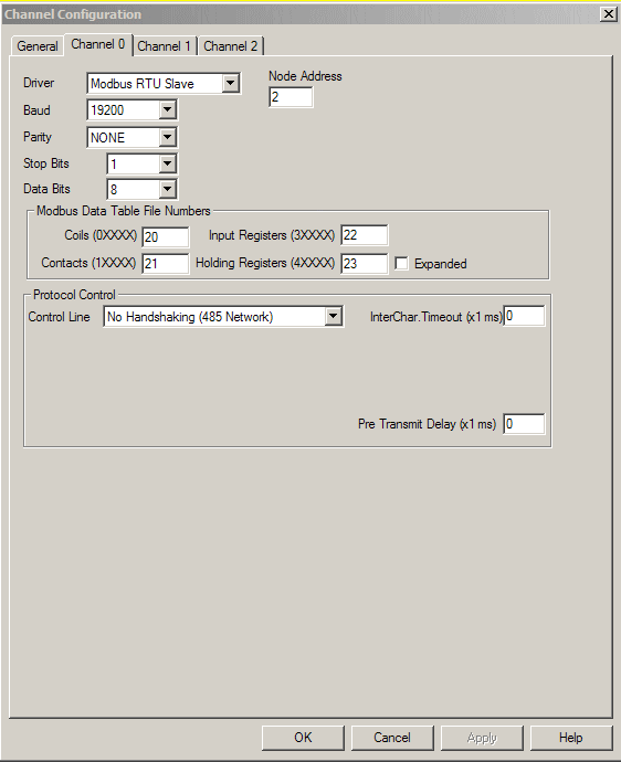To configure the respective channel for Modbus communications, you'll have to open your project up in RSLogix 500. On the Project Navigation Tree (to the left of the program display), click on Channel Configuration and at the Driver pull down menu, select Modbus RTU Slave. Next, select the desired Baud Rate, Parity, Stop & Data bits which will be the setup of the host device you'll be communicating with. Next, you'll want to select your Modbus File #'s. These file #'s will reference files in your project. Refer to the image below for the Channel Configuration example: